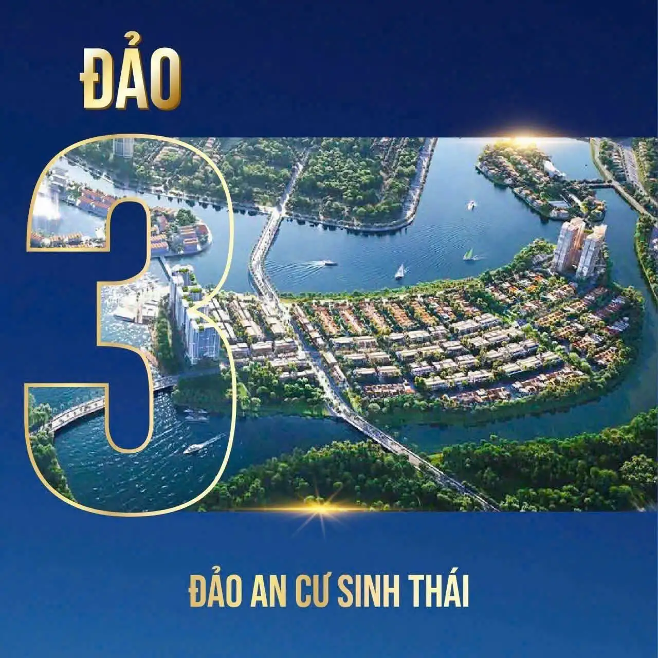 Đảo 3 rộng 44ha, là phân khu an cư cao cấp hướng đến cộng đồng tinh hoa. Kiến trúc đương đại kết hợp họa tiết Champa tạo dấu ấn thẩm mỹ giữa không gian sông nước. Mảng xanh lớn, cảnh quan thư giãn và tính riêng tư cao biến nơi đây thành “ốc đảo sống sang”, phù hợp cư dân tìm kiếm sự yên bình và đẳng cấp tinh tế.